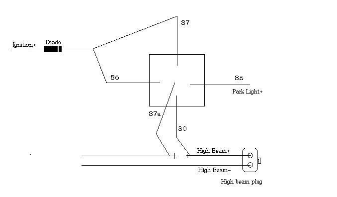 You can get the relay from a 96-99 Cavalier (I know the bodies went 95-99, but 95 has different wiring) on the inside of the front bumper, there are 2-5 standard relays depending on the model, with plugs and wiring. One with the 30, 85, 86, 87, 87a. The way I've done this, it works just like any modern day high beam DRL system. The high beams come on at ~ half power with the ignition turned on, and are disabled when the parking lights are engaged. It only requires splicing into one of the high beam plugs, so you don't have to run wires all over the engine bay. If you do this to the left light, the right one automatically follows suite. If anybody is interested, I'll write up a DIY and get a wiring diagram. Here's the way it works basically, the headlights, when turned on, have power to the low and high beam all the time, when the high beams are engaged, they are given a ground. So when the lights are off, there is no power or ground to the high beams, if you give power to the power wire, the ground wire half ass grounds, and you get about half power to the lights. Since the left and right are set together before the fuse at the relay, they both work together. With one of these relays, you can give constant power to the source (in this case it would be the positive wire from the car for the high beams) or you can give power when the relay is activated. The relay is activated simply by a positive and negative, the positive is given to the relay from a power source off the ignition (I used the ignition power wire from the power window relay) and when grounded through a power source (in this case, the positive wire from the parking lights) it will ground out when there is no power given to the parking lights. Then when the parking lights are activated, there is now power to that wire, and the ground is cut off, thus deactivating the relay, and taking away the power to the high beams. The reason the diode is needed, is because when the ignition is off, and the lights are on, the power is now reversed, there is power given to the relay through the parking lights, and it is grounded through the ignition positive. The diode only lets power go one way, so the system can't work in reverse. If any of you are still with us, congratulations, you have a basic understanding of how relays work now. ![]() If you've just read through all this, and had a brain hemorrhage, that's alright, you don't really need to know how this all works, that was my job, all you have to do is connect the wires were I tell you to. ![]() Here's the relay wiring diagram, I'll get pictures of the wiring in the car, so you know what wires to put where. This is all I have for now, when I get a hold of a digicam, I'll get some pics. ![]()