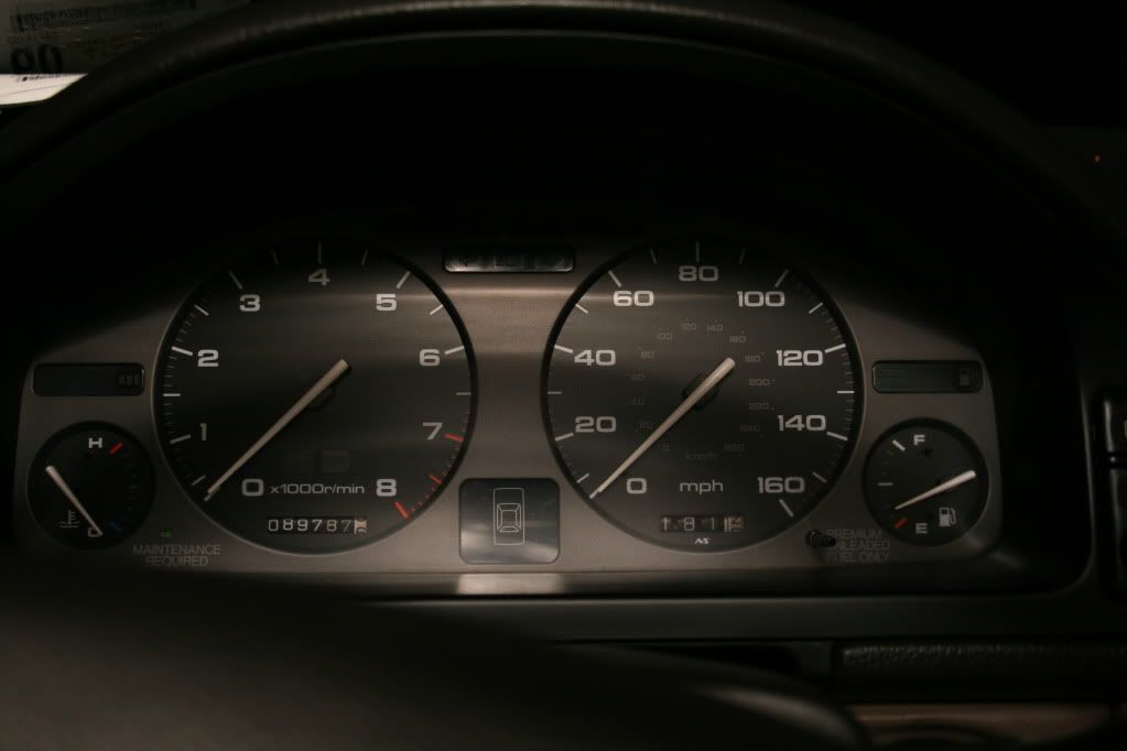 As some of you know, I picked up a set of 7 spoke rims in St. Louis on my way to NALM. They have 65000 original miles on them and they're in great condition. Its a shame that the coupe of the guy I bought these off of didn't make it to NALM because his coupe was in just as good shape. His coupe is in such good shape actually, that he tossed these 7 spoke rims, rims that I would describe as a smidge short of mint, because they were too beat up for the rest of the car. In any event, I've been on the prowl for a set of 7 spokers for December ever since I saw Blingting's car at NALM '08. December's GS rims are certainly in good shape but they fall considerably short of mint, especially in direct sunlight. I had Yokohama H4s mounted yesterday and I christened my hydraulic jack by installing these rims.  Oh, right... I put them on the coupe because I wanted to put these new and expensive tires through their paces. December can't do this because she needs a timing belt and therefore does not see revs above 4 grand. Rims can be changed easily as I planned to do anyhow, it just turns out that the coupe gets the first shift.  I have to say, I've always found the coupe's slightly smaller nature to fit the 7 spokers better while the sedan can make use of the extra metal in the GS rims because of its larger, longer, more stately look.         I love these tires  . (December's GS rims have the same yoko V4s)  A couple of Mark's NALM pictures inspired me to experiment with angling shots...  Heres a little bonus. Passed this little milestone a couple days ago. Unfortunately my cluster has been replaced at some point in the past so this is approximately 200k miles. The coupe is officially broken in.  As a bonus to help kick off the gallery in this new forum, here are some never before seen shots of the coupe as she was when I bought her.   Eww.    And of course this is how the inside turned out:  Pedal pads, a clean shift knob, a fresh e-brake button and some JDM door sills really make a big difference.